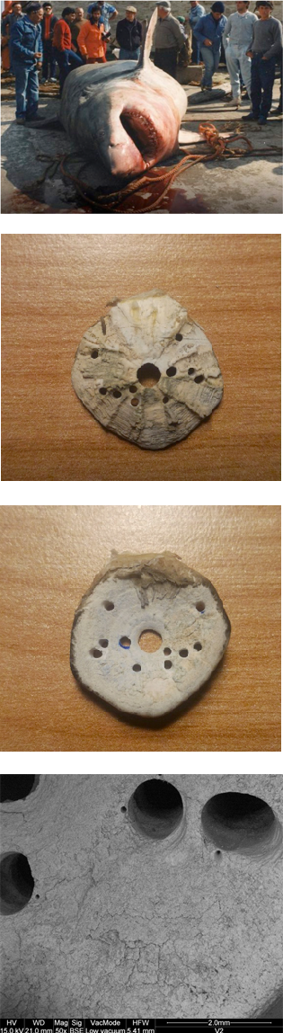 Given that white shark’s sightings are rare in the Mediterranean and the possibility of obtaining samples is highly limited, the aim of this research was to provide general information regarding the concentration of trace elements and stable isotopes (δ15N and δ13C). Laboratory analyses were performed on 18 and 12 subsamples from two different white sharks’ vertebrae obtained from two adult specimens caught in 1987, in Favignana Island, Italy. Perforations were made along the vertebrae to describe both trace elements and stable isotopes at different life stages. A total of 38 trace elements were analysed, in which the highest concentrations were found in Fe, Sr, U, Pb, and Zn. The fluctuations of these elements during the ontogeny of both individuals could have been related to changes in diet and environment, although the specific origin remains unknown. Regarding stable isotopes, the vertebrae from the male showed an isotopic range from 9.6‰ to 10.8‰ (δ15N) and from −16.5‰ to −13.0‰ (δ13C) with a mean ± SD value of 10.3 ± 0.4‰ for δ15N and −14.6 ± 1.3‰ for δ13C; whereas the female vertebrae had an isotopic range from 9.8‰ to 11.1‰ (δ15N) and from −16.9‰ to −15.0‰ (δ13C), with a mean ± SD value of 10.8 ± 0.6‰ for δ15N and −15.8 ± 0.8‰ for δ13C. There were no significant δ15N differences (U = 6, p = 0.07346) between the two individuals. However, there were just significant differences in δ13C (t = −1.8, p = 0.049256), which could suggest sexual segregation in terms of habitat use and feeding habits.
