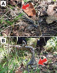 The observation we report herein was made on 21 October 2019 during a monitoring activity in the “Foce del Fiume Crati” Nature Reserve in Calabria, southern Italy (39.7130°N, 16.5102°E). During the monitoring activities, a young European asp was observed in the forested area. It was immediately realized that part of a previously swallowed prey protruded from a laceration in the left side of the animal. Despite the laceration, the viper appeared to move and behave normally. The viper was captured to see if medical assistance could be provided, and during the capture process the prey completely emerged from the laceration. It was a partially digested adult female western green lizard, decidedly large when compared to the viper. We do not know how the viper received the laceration. As it did not have other wounds on the body, predatory attack can likely be excluded as a cause of the wound. Instead, it is conceivable that the laceration was generated by the considerable size of the prey compared to the predator.