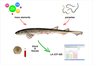 The lesser spotted dogfish Scyliorhinus canicula has an important role in the trophic web of demersal fish communities, representing an important trophic link between invertebrates and larger predatory fish. Despite its scientific interest, there is still scarce knowledge about many biological and ecological aspects of this shark. Parasitological, hematological and ecotoxicological analyses were carried out on a population of lesser spotted dogfish S. canicula from central Mediterranean. Parasitological analyses highlighted a poor helminthic community, highly dominated by a single taxon represented by the cestode Nybelinia sp. and no differences between females and males were observed. Hematological analyses showed that the number of leukocytes was significantly lower in the sharks that resulted parasitized: this was probably due to the ability of some trace elements (like As) in weakening of the immune system, exposing the animals to a higher risk of parasite infection. Trace elements analyses were performed in vertebrae, skin, and liver tissues and the most abundant and potentially toxic elements were: Pb, As, Cd, Mn, Zn, Ni and Fe. Pb, As and Mn showed the highest concentrations in vertebrae due to the diet of the sharks; Fe and Ni in the skin, due to their presence in the water column where animals were collected, and Cd and Zn in the liver, linked to their ability to induce trace elements binding metallothionein proteins (MT), which can reduce the concentration of Cd. These results confirm that elasmobranchs, being predators at the apex of the marine food chain, act as final receptors for a series of polluting elements regularly discharged into the sea that could weak their immune system increasing the parasitic load. For that reason, they could be considered as bioindicator of the health status of marine ecosystems.