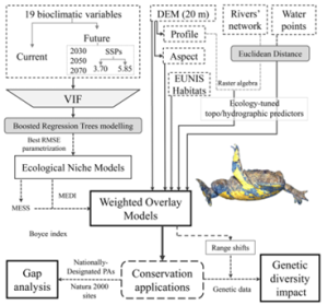 Climate and land cover changes are the two most important stressors causing the decline of amphibians’ populations worldwide. Within the Mediterranean area, one of the global biodiversity hotspots, the endemic Italian yellow-bellied toad (Bombina pachypus) suffered the same fate, as the decreases and local extinctions proved over time. Since the need to preserve this Apennine endemic species is evident, we take advantage of a novel approach combining climate-based ecological niche models and post-modelling GIS techniques (i.e., the weighted overlay framework) to produce finer species distribution models for B. pachypus. In doing so, we coupled climate variables with topographic-, hydrologic-, and habitat-related predictors, sharpening the potential species’ distribution at its whole range scale. Our findings show a latitudinal subdivision in predicted suitability: Central Apennines populations are expected to suffer more than the Northern ones, with considerable potential future losses of genetic diversity. On the contrary, Southern Apennines’ suitability is predicted to remain stable over time, preserving the vast diversity. When assessing the coverage that protected areas offer to the locations of suitable habitats for B. pachypus, the protected sites of the Central Apennines result in slightly less suitable conservation areas than those in the Northern and Southern Apennines. The overall protected areas coverage is currently low (~20%) and predicted in the future to narrow towards medium suitability values, except in Southern Apennines, where an increase is inferred. In light of our spatially-explicit results, we suggest that a national-scale conservation strategy should consider different management options according to the sub-territories that our analyses highlighted. Our coupled “weighted modelling – spatialised genetic inference” approach permits us to support different conservation policies at all spatial scales, capitalising on relatively few input data. Also, in-depth spatial analyses should be performed to support effective protection strategies and management for the conservation stakeholders.