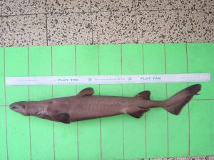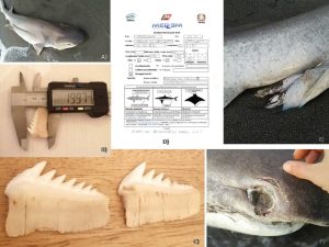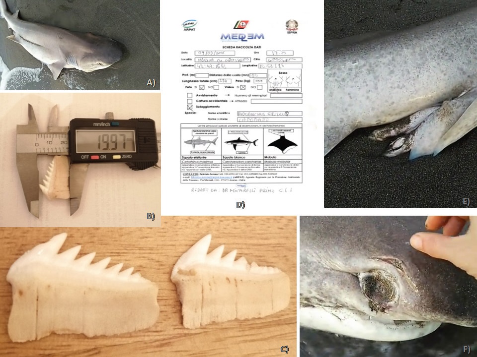 A rare stranding event involving a 297 cm long mature male bluntnose sixgill shark (Hexanchus griseus) occurred on the Tuscan coast in the central Tyrrhenian Sea. The stranded specimen had 6 rows of teeth indicating that it belonged to the H. griseus and not to the Hexanchus nakamurai species, which only has 5. Biometric data on two teeth of the left front region of the lower jaw were collected. The body of the specimen did not show evidence of capture, only a deep cut at the height of the orbital arch suggesting a crash or the ramming of a boat.