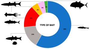 The influence of environmental factors on prey discrimination of bait-attracted white sharks was studied over a six-year period (2008–2013) at Dyer Island Nature Reserve (Gansbaai, South Africa). Across 240 bait-attracted feeding events observed in this period, both immature and mature white sharks were attracted by the seal-shaped decoy rather than the tuna bait, except for the years 2008 and 2011. Tide ranges, underwater visibility, water temperature, and sea conditions were, in decreasing order, the factors which drove white sharks to select the seal-shaped decoy. High tide lowered the minimum depth from which sharks could approach seals close to the shore, while extended visibility helped the sharks in making predatory choices towards the more energy-rich prey source, the odorless seal-shaped decoy. On the contrary, warmer water is associated with an increase in phytoplankton that reduces underwater visibility and increases the diversity of teleosts including tuna—a known prey of white sharks—driving the sharks to favor the tuna bait. Overall, sea conditions were almost always slightly rough, ensuring a good average underwater visibility. Recommendations for future research work at this site are presented.