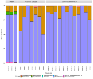 Our knowledge regarding the role of the microbiome in fish health has been steadily increasing in the last decade, especially for species of commercial interest. Conversely, relatively few studies focus on the microbiomes of wild fish, especially apex predators like sharks, due to lower economic interest and greater difficulty in obtaining samples. Studies investigating microbiome differences between diverse anatomical locations of sharks are limited, and the majority of the available studies are focused on the microbial diversity present on shark teeth, with the aim of preventing infections due to bites of these animals or evaluating the presence of certain pathogens in healthy or diseased specimens. Here, we investigated the skin, mouth, gills, and cloaca microbiomes of five individuals of two phylogenetically distant species of sharks (Prionace glauca and Somniosus rostratus) to obtain a better understanding of the diversity regarding the microbiomes of these animals, how they change throughout different body parts, and how much they are influenced and determined by the ecology and evolutionary relationship between host and microbiome. To confirm the taxonomy of the sharks under study, we barcoded the specimens by sequencing the mtDNA COI from a biopsy of their skin. Microbial diversity based on the 16S rRNA gene reveals that partially overlapping microbiomes inhabit different body parts of each shark species, while the communities are distinct between the two species. Our results suggest that sharks’ microbiome species-specific differences are controlled by the ecology of the shark species. This is the first study comparatively analyzing the microbiome diversity of different anatomical locations in two shark species of the Mediterranean Sea.