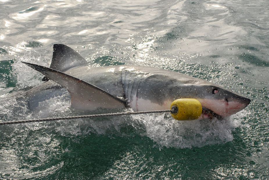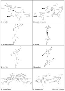 Knowledge about the social behavior of sharks is a growing research field, but not many observations are available on the social interactions between pairs of sharks in the presence of passive surface bait and mainly related to aggregations. Between 2009 and 2018, in Gansbaai, South Africa, 415 white sharks were sighted, and 525 surface-generated social interactions were identified, exhibited by 169 different white sharks. The mean sighting rate was 0.91 (range 0.18–1.53) white sharks per hour. Eight patterns of social interaction were exhibited: swim by, parallel swim, follow/give way, follow, give way, stand back, splash fights, and piggyback. Non-random interactions occurred when pairs of specimens approached the passive surface bait, confirming that the white sharks made a real choice, showing a dominance hierarchy during the ten years of data collection. Evidence of non-random social interactions in the surface behavior of bait-attracted white sharks Carcharodon carcharias in Gansbaai’s transient population was the goal of this research.